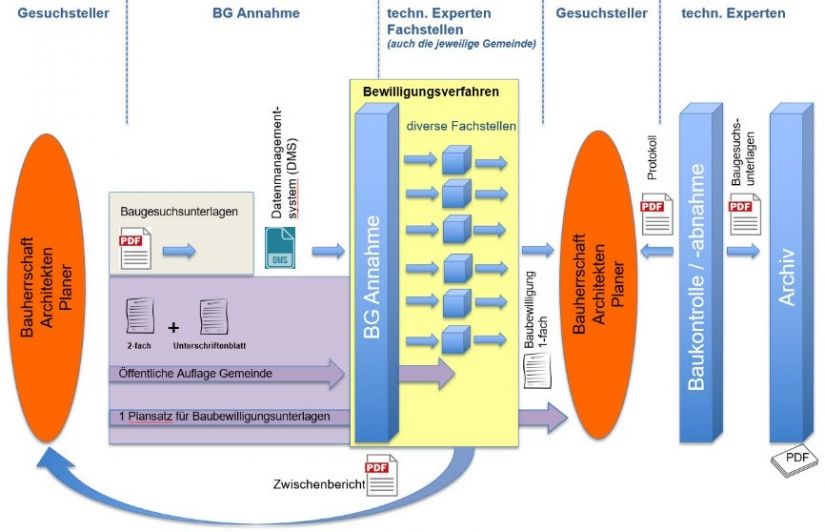 In der oben abgebildeten Grafik, werden die verschiedene Stellen im Baugesuchsprozess aufgezeigt. Alle involvierten Instanzen können im digitalen Prozess bereits ab Beginn der Freigabe parallel an den Baugesuchen arbeiten.